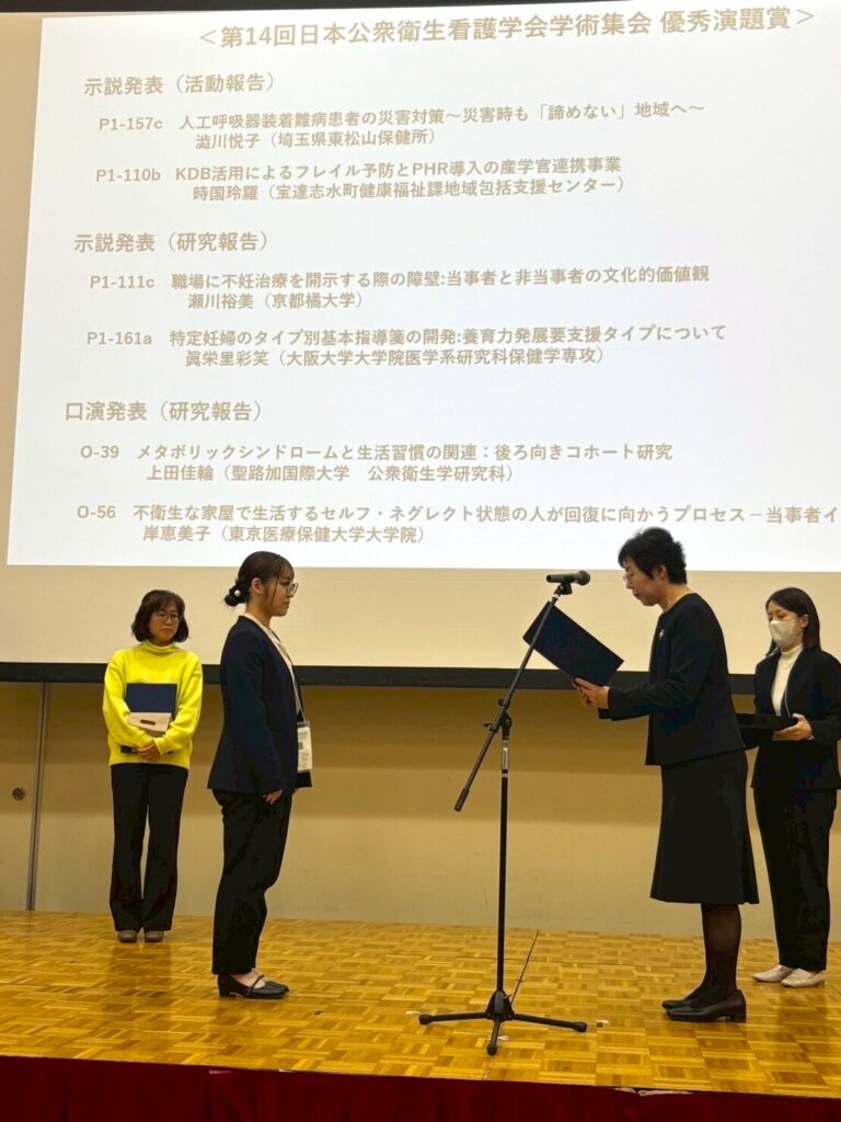 本学の塚田久恵教授および米澤洋美教授が共同研究者として参画した研究が、12月13日(土)・14日(日)に開催された「第14回日本公衆衛生看護学会学術集会」において、優秀演題賞(示説・活動報告部門)を受賞しました。