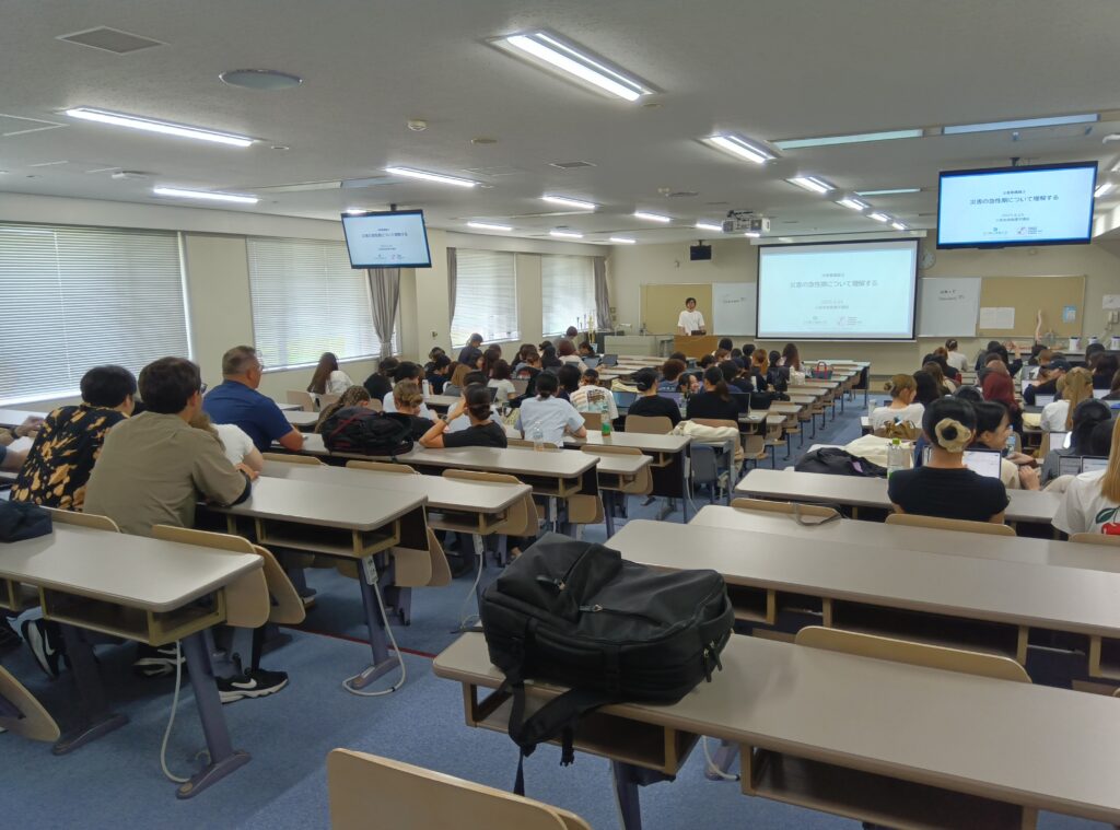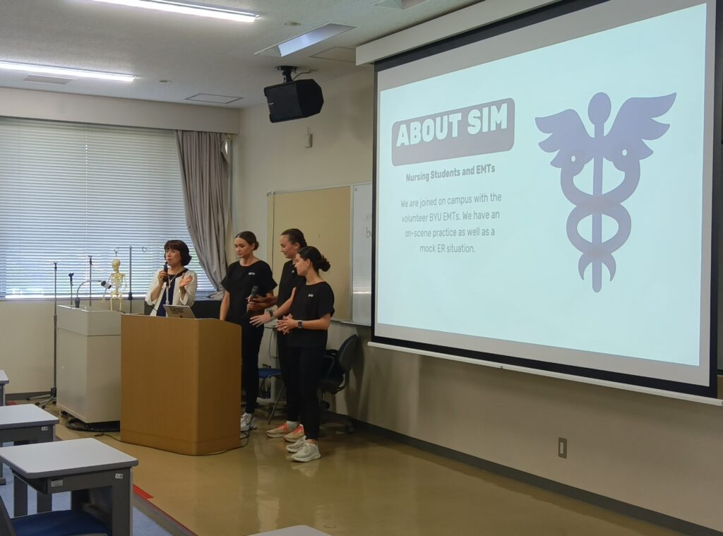 まずはじめに(3限)、木田教授から災害急性期に特徴的な疾患や病態、トリアージ法(START法・PAT法)などに関する講義を行い、その後BYUの学生から大規模災害シミュレーションについての説明を行いました。