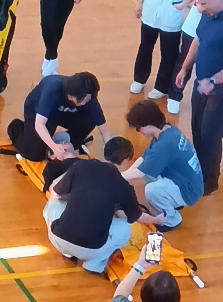 4限には、受傷をメークアップした多数の模擬患者さんをトリアージし搬送する訓練を体育館で行いました。
