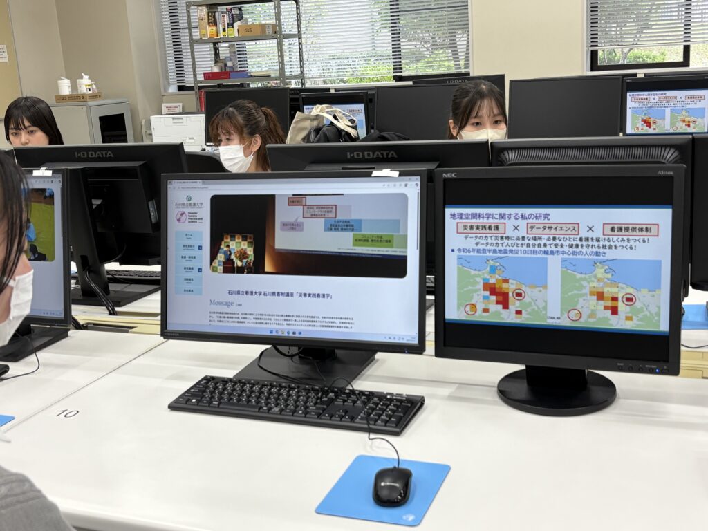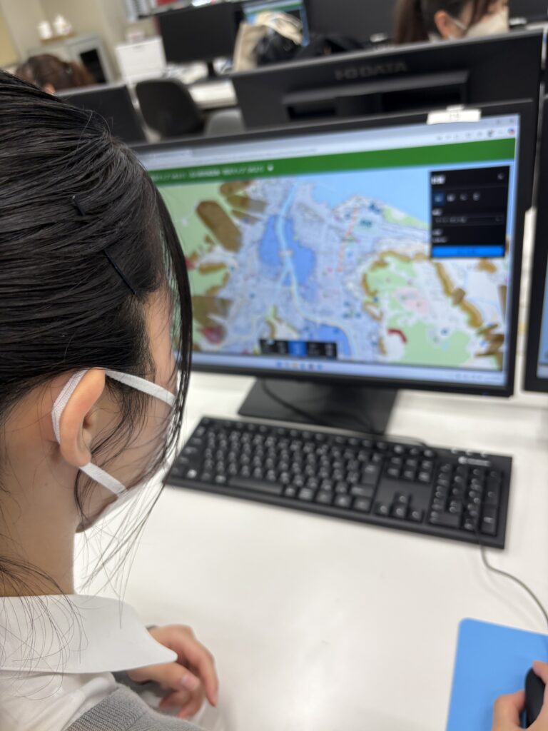 研究ミニイベントでは、木田教授が開発中の「地域医療・防災マップ(β版)」を操作し、生徒さん自身が関心のある地域の災害ハザードや地域医療資源を閲覧したり、オーダーメイドのハザードマップを作成したりしました。